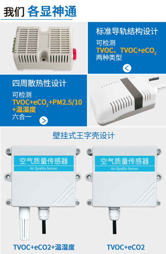 壁掛式空氣質(zhì)量傳感器,TVOC+eCO2,TVOC+eCO2+溫濕度,參數(shù)自由定制,內(nèi)置防水探頭,探頭外殼多氣孔設(shè)