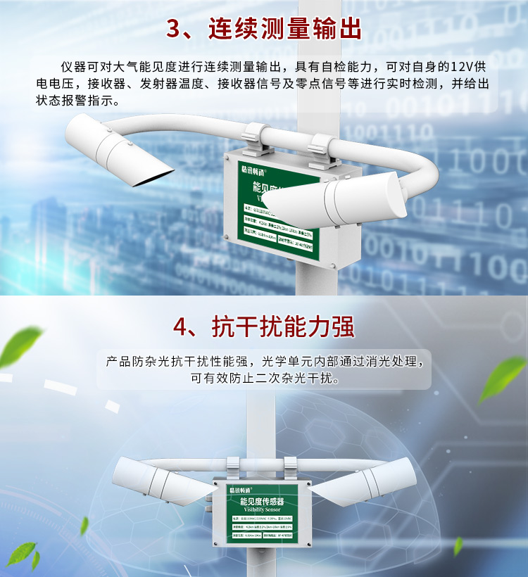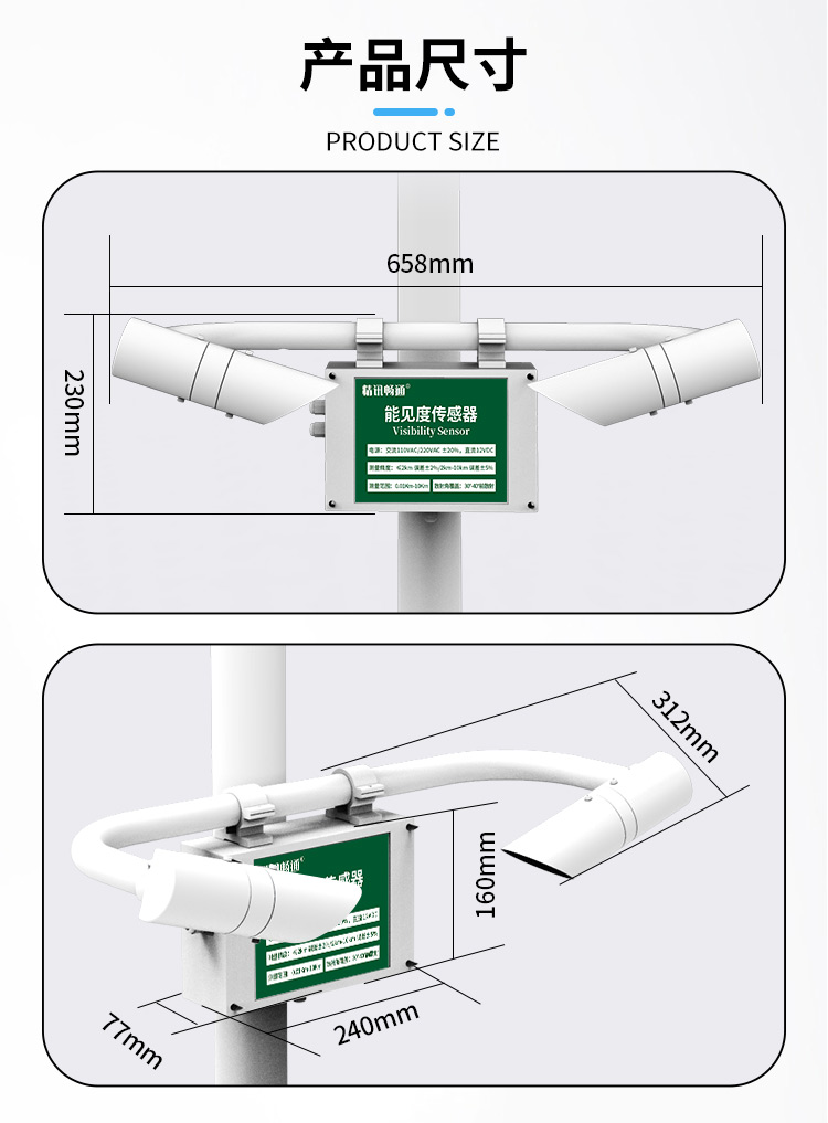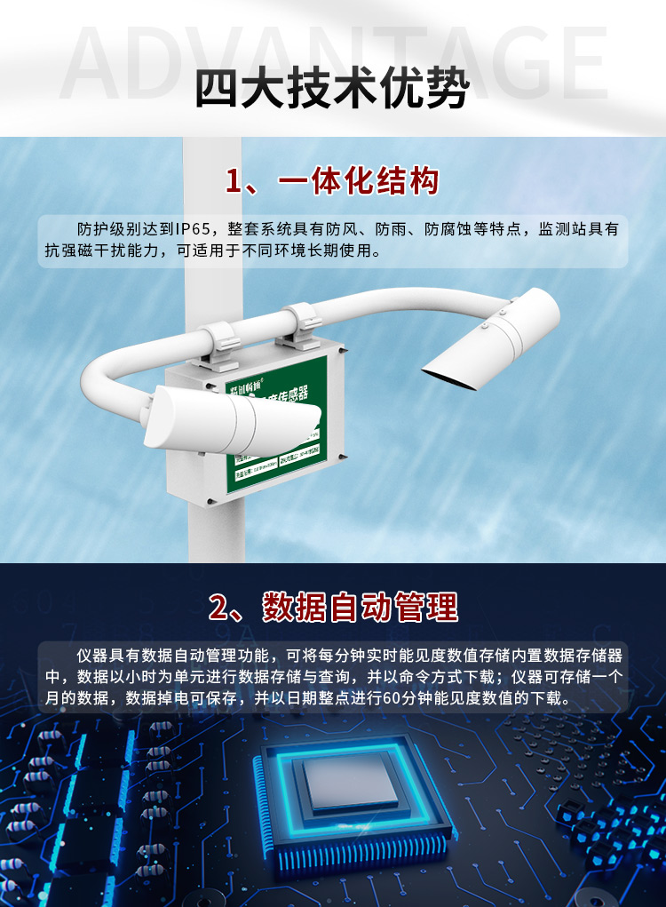 能見度傳感器是用來檢測大氣能見度的大氣監(jiān)測設(shè)備。由光發(fā)射器、光接收器及微處理控制器等主要部件組成。能見度監(jiān)測儀可對大氣能見度進行連續(xù)監(jiān)測輸出,可對數(shù)據(jù)自動管理,存儲一個月的數(shù)據(jù),掉電可保存。能見度傳感器采用了一體化結(jié)構(gòu),具有防風、防雨、防腐蝕、抗干擾能力強、功耗低、緊湊小巧等特點。