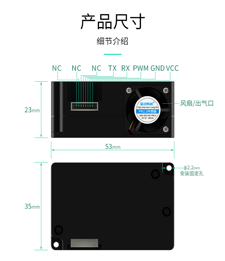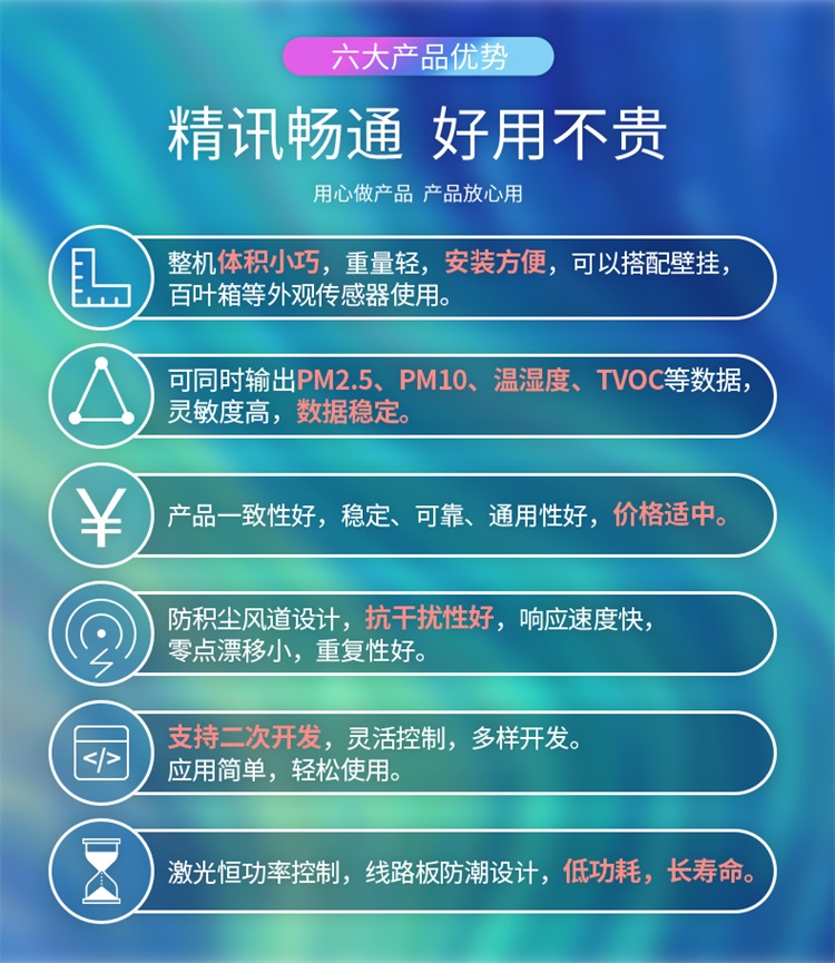 2.可同時輸出PM2.5、PM10、溫濕度、TVOC等數據, 靈敏度高,數據穩定。