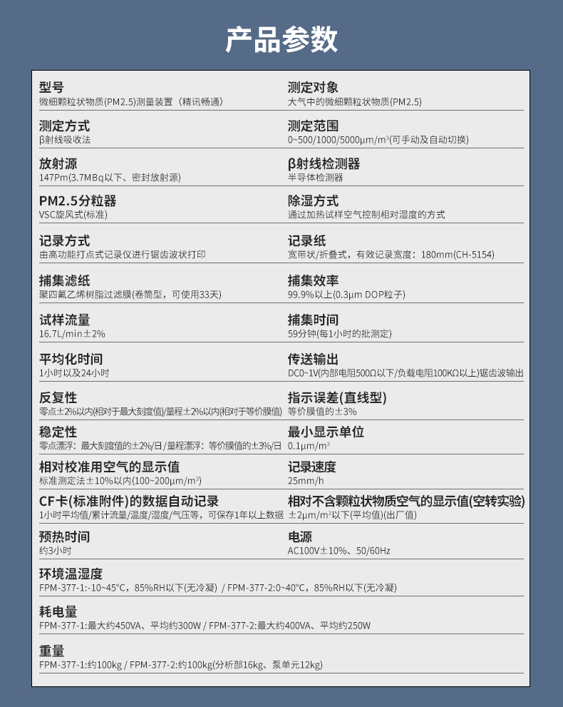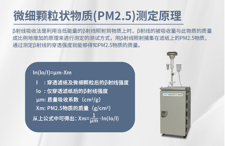 β射線吸收法是利用當低能量的β射線照射到物質上時,β射線的被吸收量與此物質的質量成比例地增加的原理來進行測定的測試方式,用β射線照射捕集在濾紙上的PM2.5物質,通過測定β射線的穿透強度就能夠得知PM2.5物質的質量。