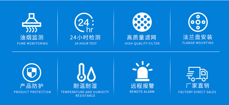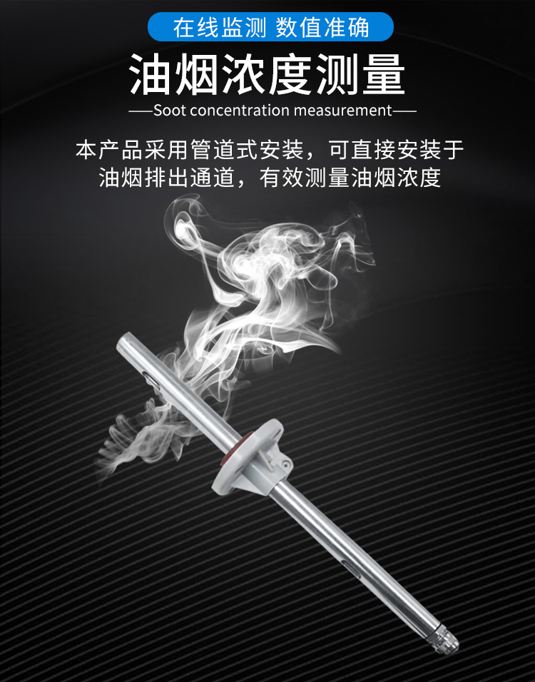 1、油煙濃度測(cè)量:在線監(jiān)測(cè)數(shù)值準(zhǔn)確,油煙傳感器采用管道式安裝,可直接安裝于油煙排出通道,有效測(cè)量油煙濃度;