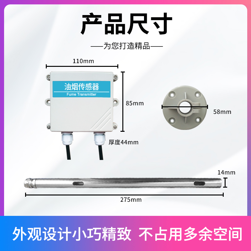 4、防濕防潮:油煙傳感器采集探頭耐溫耐濕,可長期工作于80℃油煙環境,新型結構設計,采樣位置長期免清洗免維護;