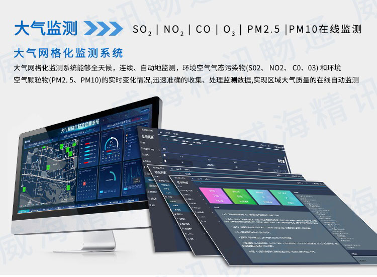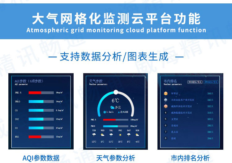 監測類型:溫濕度、噪音,AQI六參數(PM2.5、PM10、NO2、CO 、SO2、O3)。