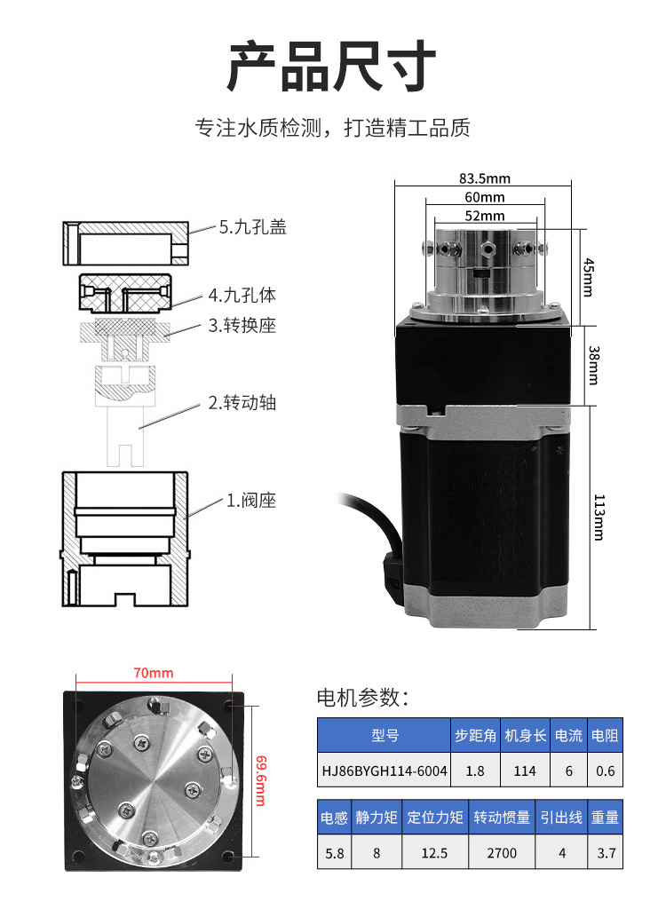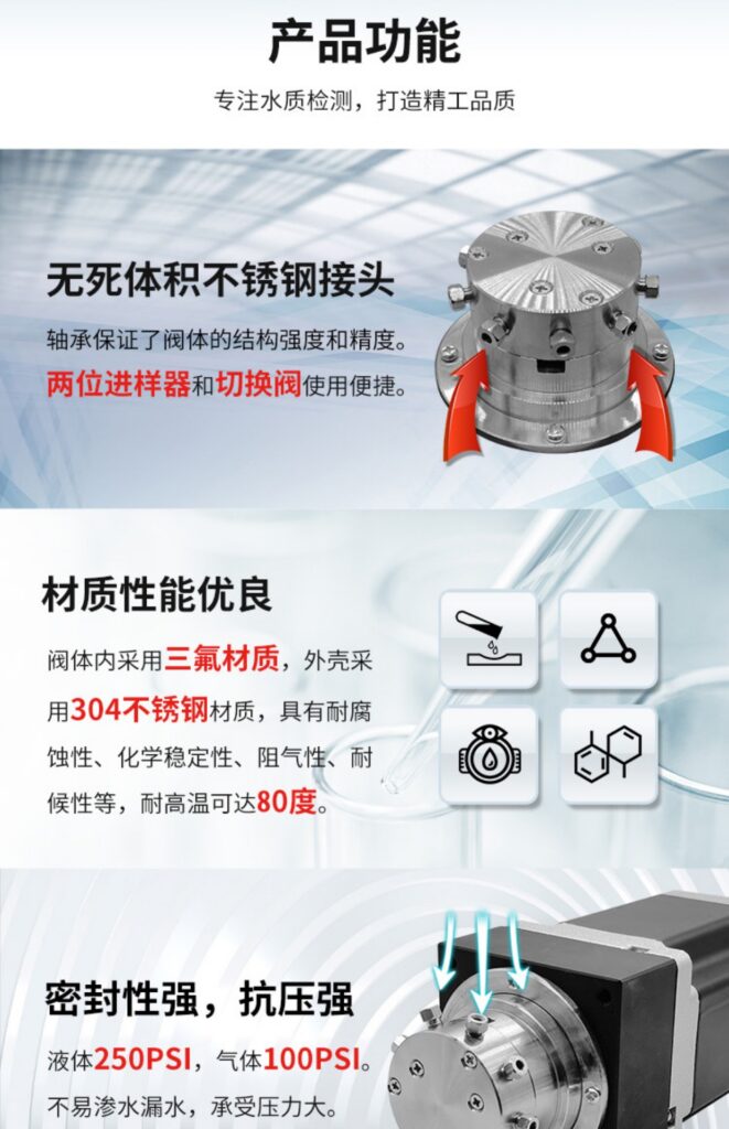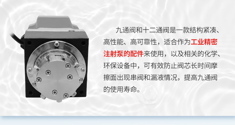 水質(zhì)九通閥十二通閥是一款結(jié)構(gòu)緊湊、高性能、高可靠性的閥門,是水質(zhì)在線監(jiān)測設(shè)備的配件,適合作為工業(yè)精密注射泵的配件來使用,以及相關(guān)的化學(xué)、環(huán)保設(shè)備中,可有效防止閥芯長時(shí)間摩擦面出現(xiàn)串閥和漏液情況,提高水質(zhì)九通閥的使用壽命。閥體內(nèi)采用三氟材質(zhì),外殼采用304不銹鋼材質(zhì),具有耐腐蝕性、化學(xué)穩(wěn)定性、阻氣性、耐候性等,耐高溫可達(dá)80度。