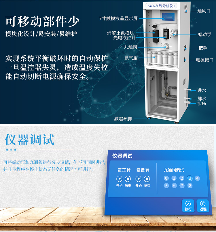 3、自動檢測自動清洗:國標法水質在線分析儀可自動清洗采樣管道、計量單位、消解反應單位、測量單元的管線。