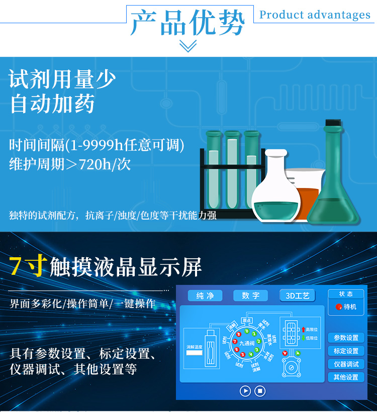 1、試劑用量少自動加藥:時間間隔(1-9999h任意可調) 維護周期>720h/次; 獨特的試劑配方,抗離子/濁度/色度等干擾能力強;