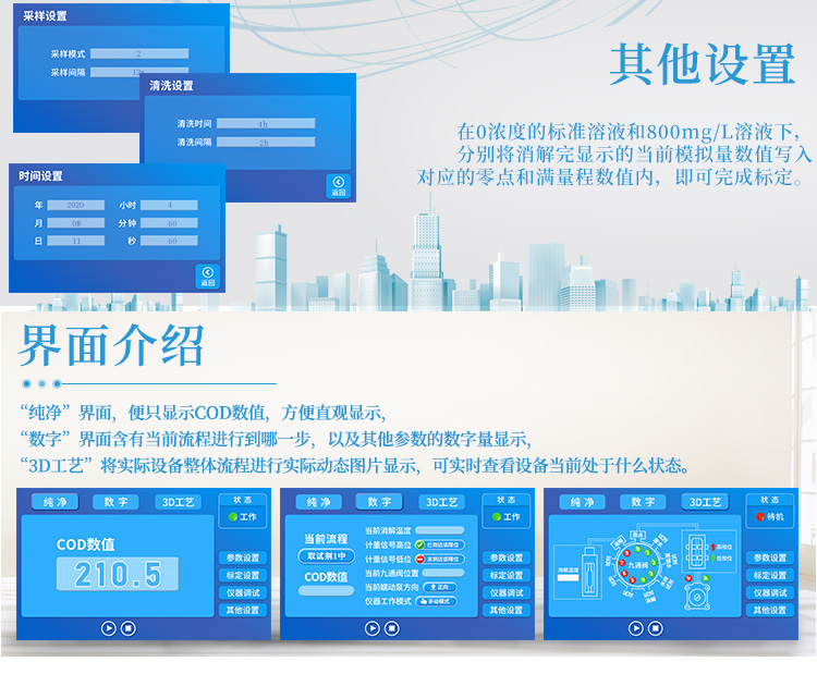 2、7寸觸摸液晶顯示屏:國標法水質在線分析儀具有參數設置、標定設置、儀器調試、其他設置等;界面多彩化/操作簡單/一鍵操作;