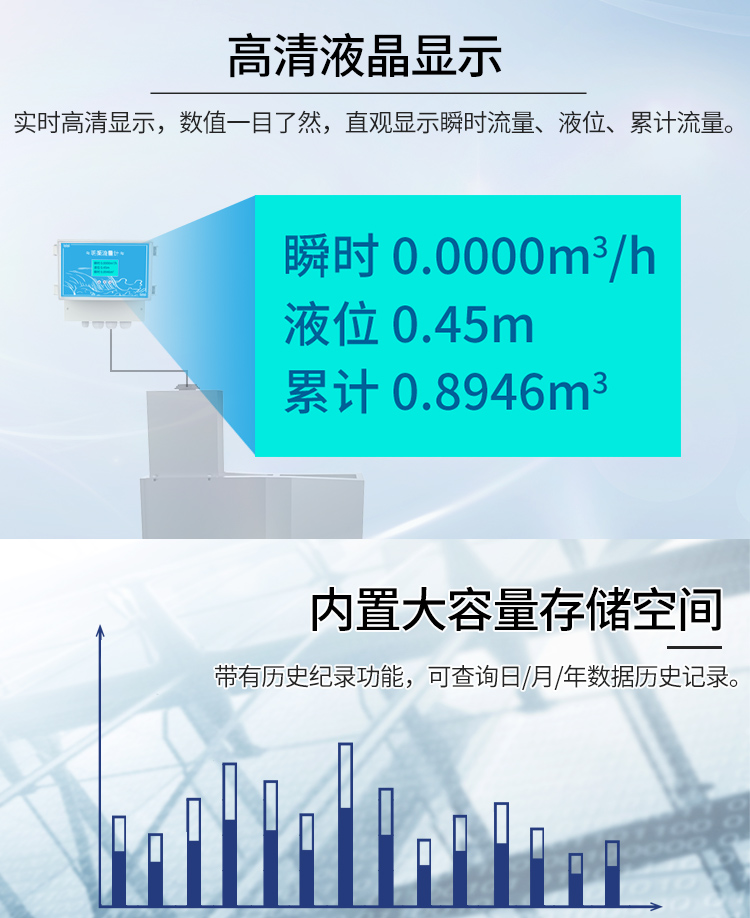 3、明渠流量計(jì)內(nèi)置大容量存儲(chǔ)空間:帶有歷史紀(jì)錄功能,可查詢?nèi)?月/年數(shù)據(jù)歷史記錄。