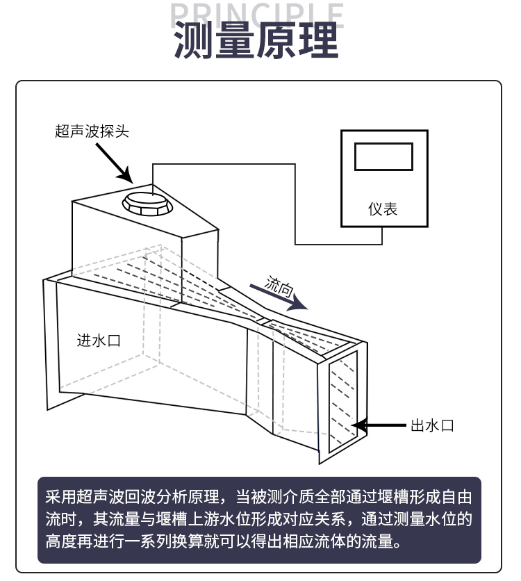 超聲波明渠流量計(jì)釆用超聲波回波分析原理,當(dāng)被測介質(zhì)全部通過堰槽形成自由流時(shí),其流量與堰槽上游水位形成對應(yīng)關(guān)系,通過測量水位的高度再進(jìn)行一系列換算就可以得出相應(yīng)流體的流量。
