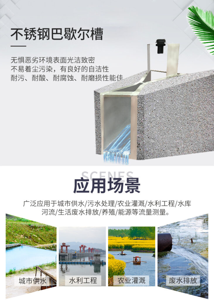6、不銹鋼巴歇爾槽:無(wú)懼惡劣環(huán)境表面光潔致密不易著塵污染,有良好的自潔性耐污、耐酸、耐腐蝕、耐磨損性能佳。
