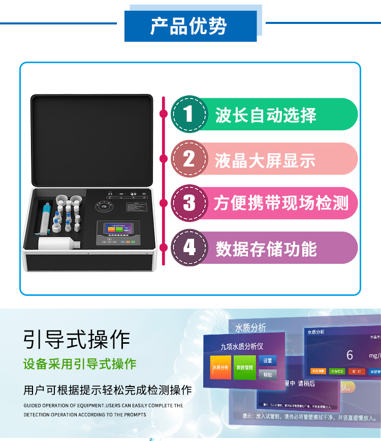 1、便攜式多參數(shù)水質(zhì)檢測儀便攜快速、操作簡單:日檢9項便攜式水質(zhì)檢測儀采用手提式獨特設(shè)計,隨走隨提,便于攜帶。操作界面簡單易懂,對操作人員要求低。成品藥劑,方便快捷、穩(wěn)定可靠。